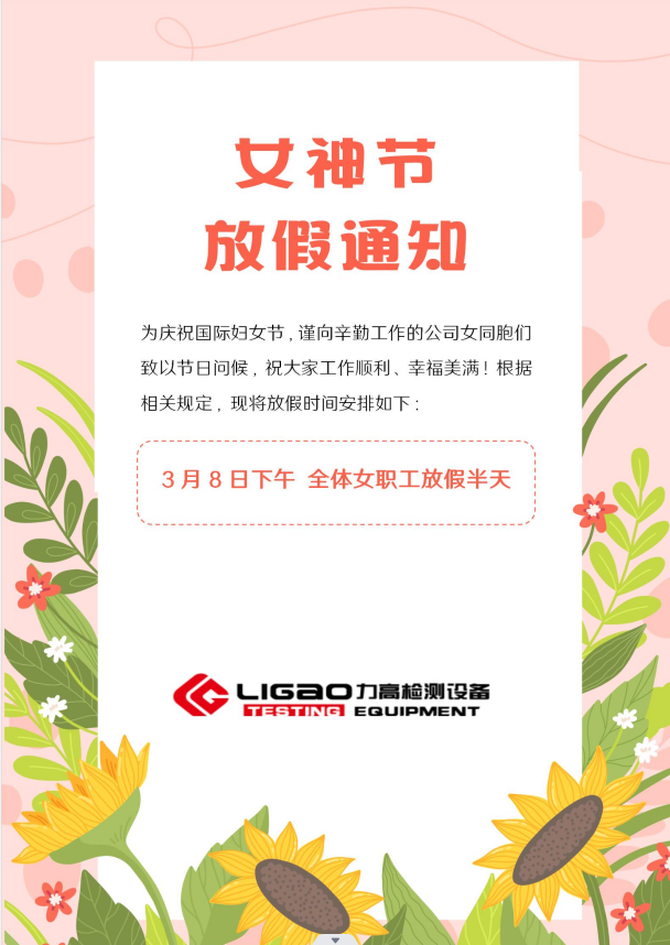 人间三月芳菲始,又是一年花开时,值此“三八”妇女节来临之际,谨向力高检测设备有限公司各位女同事致以衷心的节日问候!每位女神都是铿锵玫瑰,尽显芳华,在此,祝各位女神们节日快乐,芳华自在,笑靥如花。