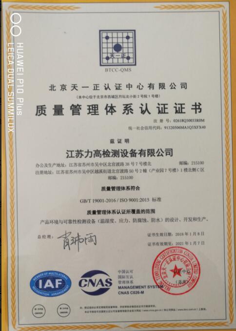 江苏力高检测设备凭借一贯的高标准、严要求、规范化生产管理及在生产实践中结合国内外先进生产经验所建立起来的完整、规范的生产体系,确保了企业生产的每一件产品都是高质量,符合国家标准。在长期的坚守中,形成产品生产质量规范化,顺利通过了ISO9001国际质量管理体系认证。